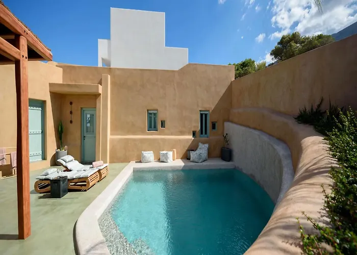 Situada a uma distância de 7 km da Praia Vermelha, Luxury Santorini Villa Potamos Luxury House 2 Bedrooms Éxo Goniá convida os hóspedes a relaxar num pátio.
